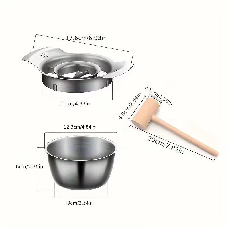 Complete Set – Includes stainless steel bowl, peeler, and wooden mallet.